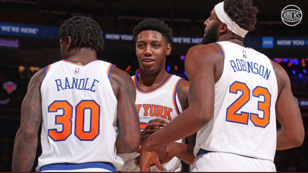 (left to right) New York Knicks’ Julius Randle, R.J. Barrett and Mitchell Robinson discuss plays in team huddle during preseason. (Source: New York Knicks)