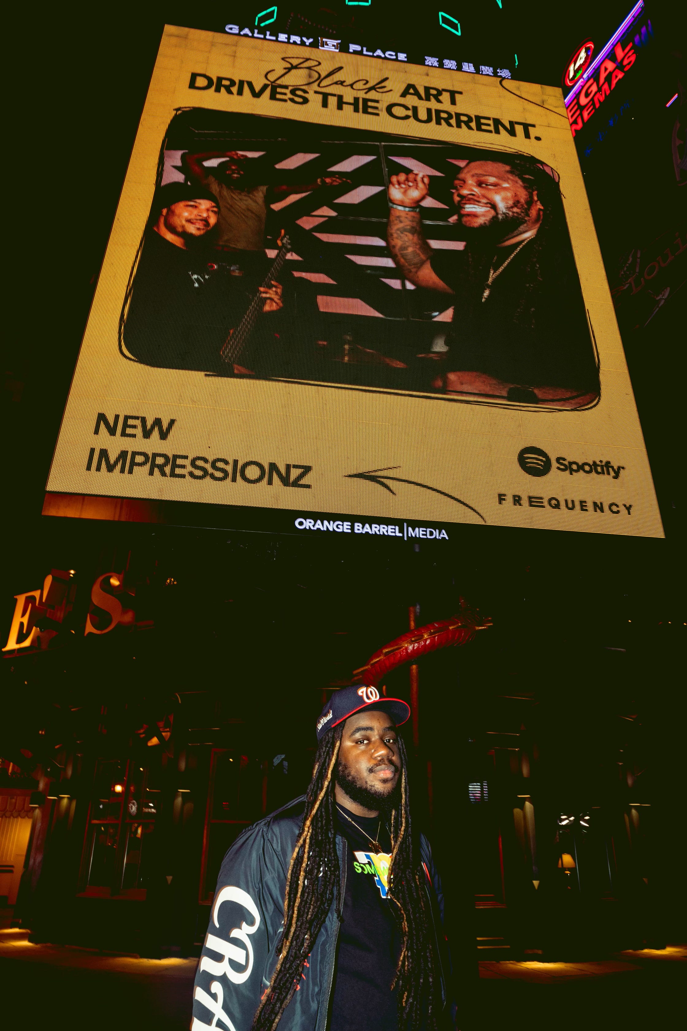 Johnnel “SidVivid” Kyri poses in front of the Spotify billboard that highlights New Impressionz and honors the #DontMuteDC movement (Source: Jada Imani M)